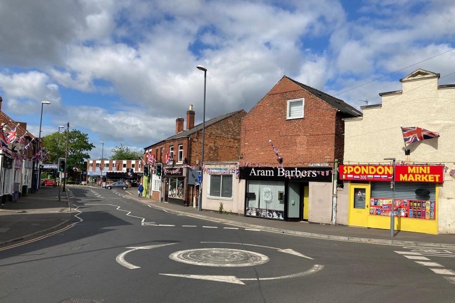 Flags and bunting fly outside the shops and businesses on Sitwell Street to mark Queen Elizabeth II's platinum jubilee in…